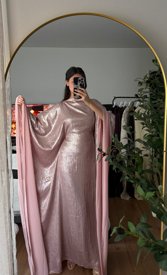 ABAYA PAPILLON EN TISSU BRILLANT ET BORDURES EN VOILE PINK