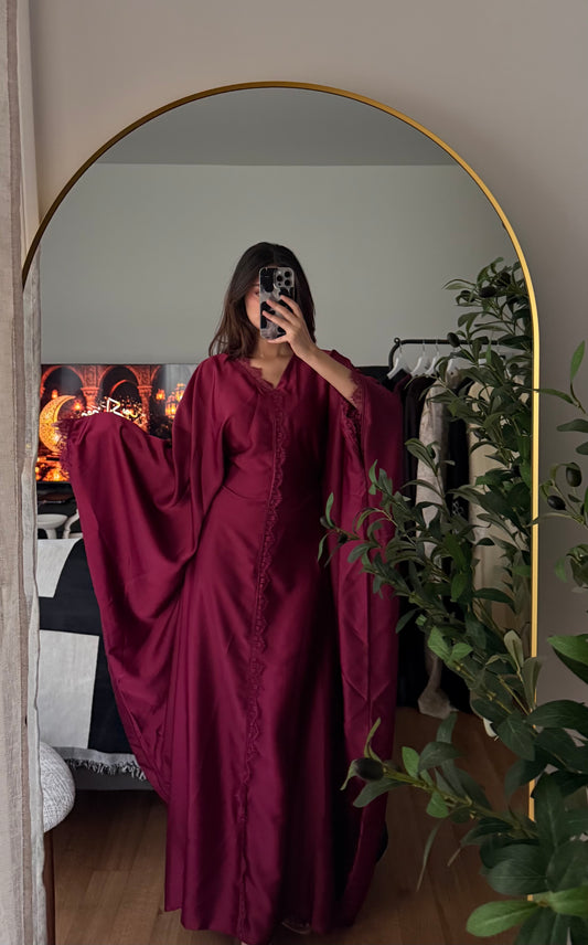 ABAYA PAPILLON À EMPIÈCEMENTS EN DENTELLE bordeaux