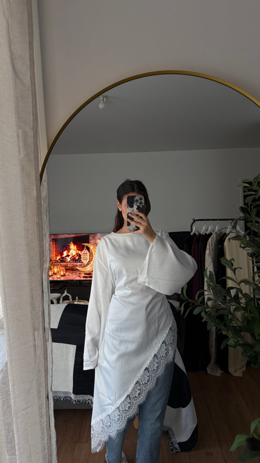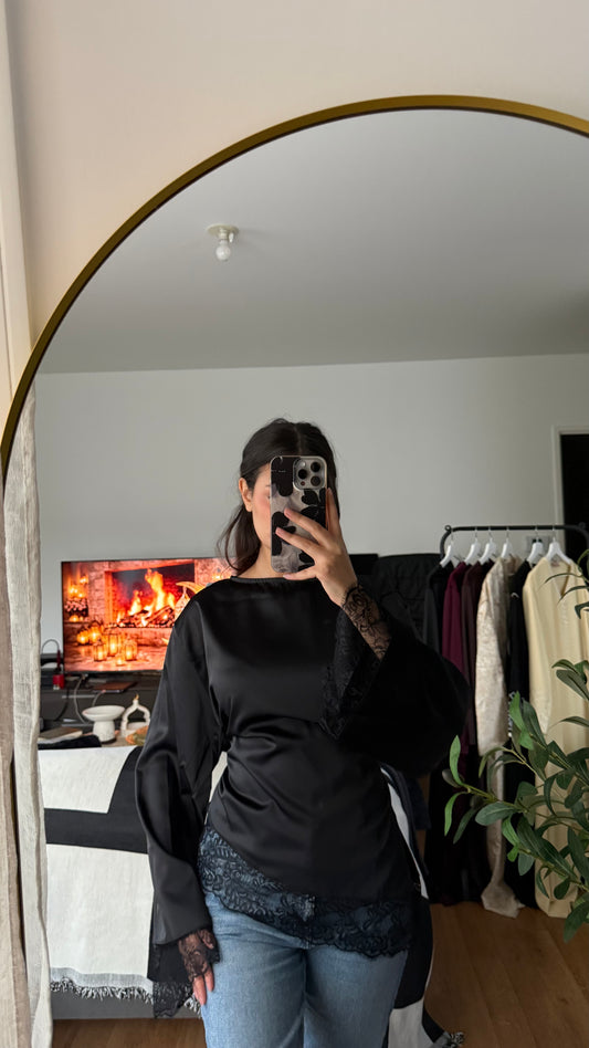 TOP SATINÉ MANCHES LONGUES NOUÉ DANS LE DOS À BORDS EN DENTELLE