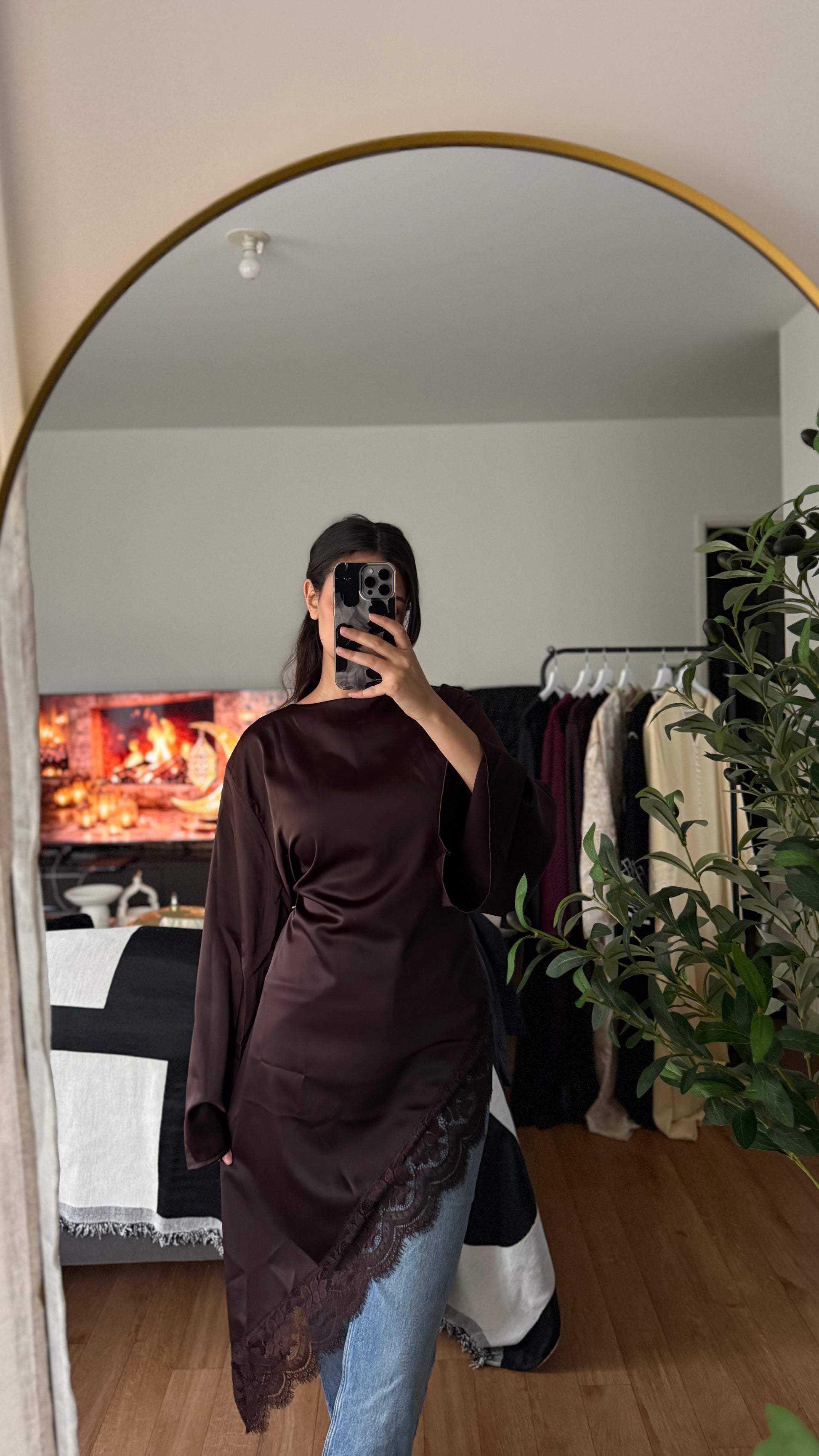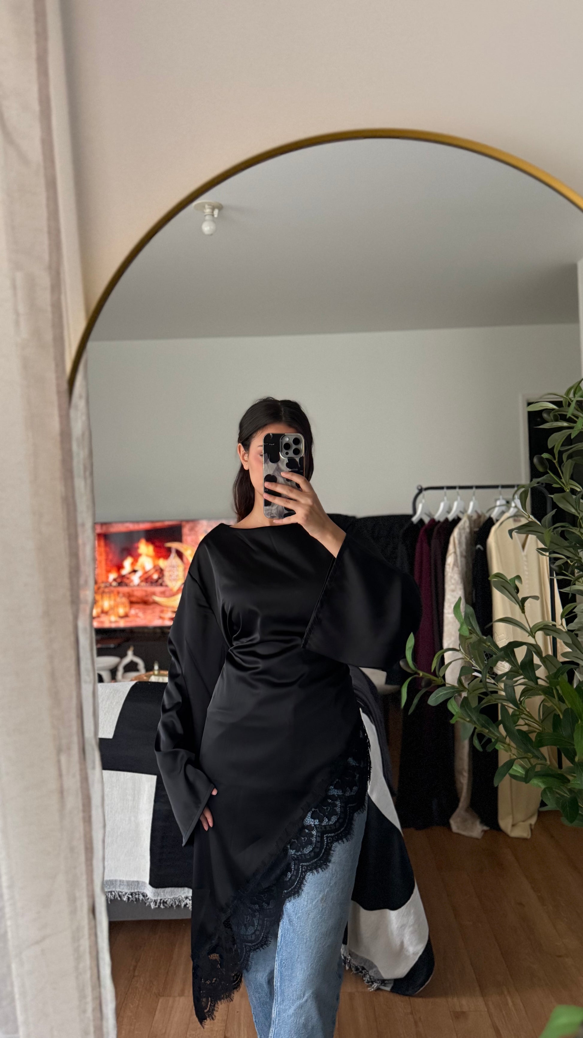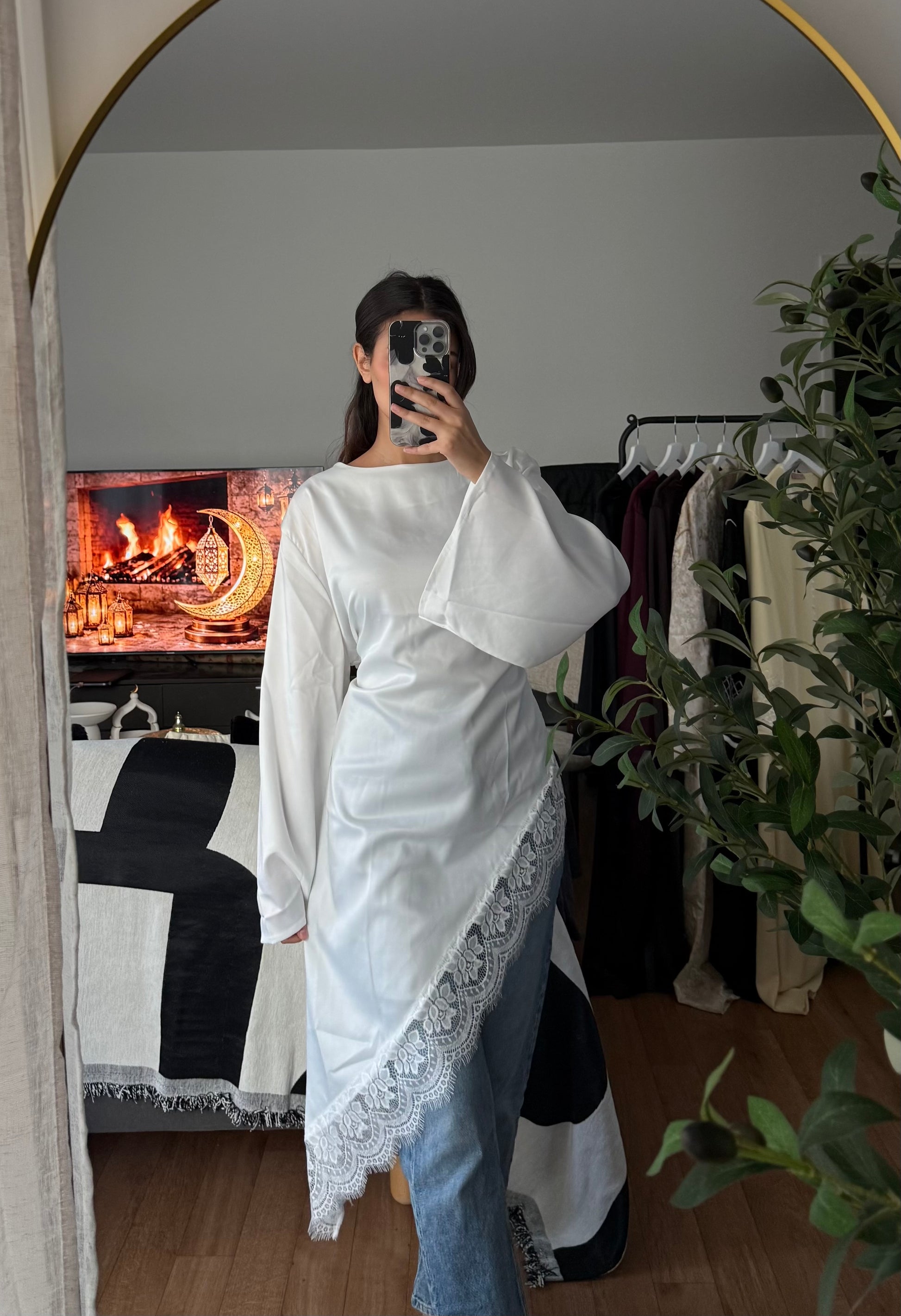 Top satiné manches longues noué dans le dos à bords en dentelle